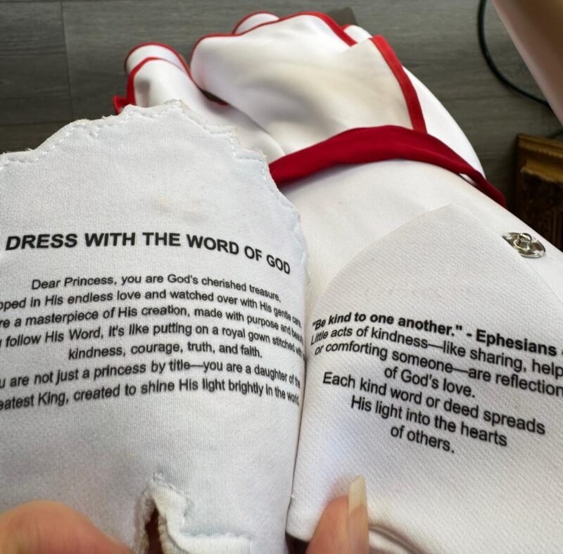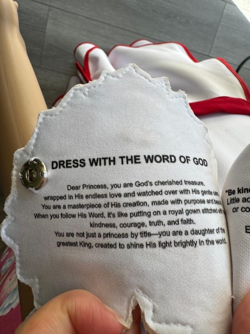 Within the embroidery, hidden Bible verses add a spiritual touch, dressing her in scripture, faith, and beauty. This unique Holy Spirit dress is perfect for church services, holy celebrations, and special faith-centered occasions.