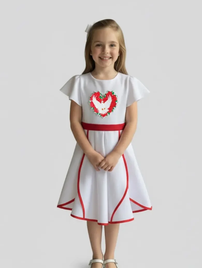 The Spirit in Bloom Dress is a faith-inspired church dress designed to celebrate grace and devotion. Made from a soft cotton blend, this white dress features petal-shaped panels accented with delicate red details and a striking red waist belt. At the chest, a finely embroidered white dove rises from red roses—symbolizing the Holy Spirit emerging from a child’s heart.