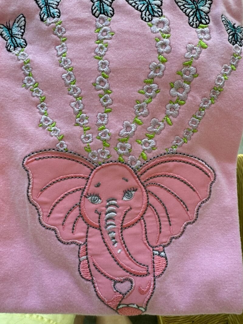 🌸 For a complete look, pair it with the matching denim jacket, where the Pink Elephant reappears in full splendor across the back—a bold yet tender statement of resilience, wonder, and playfulness.
